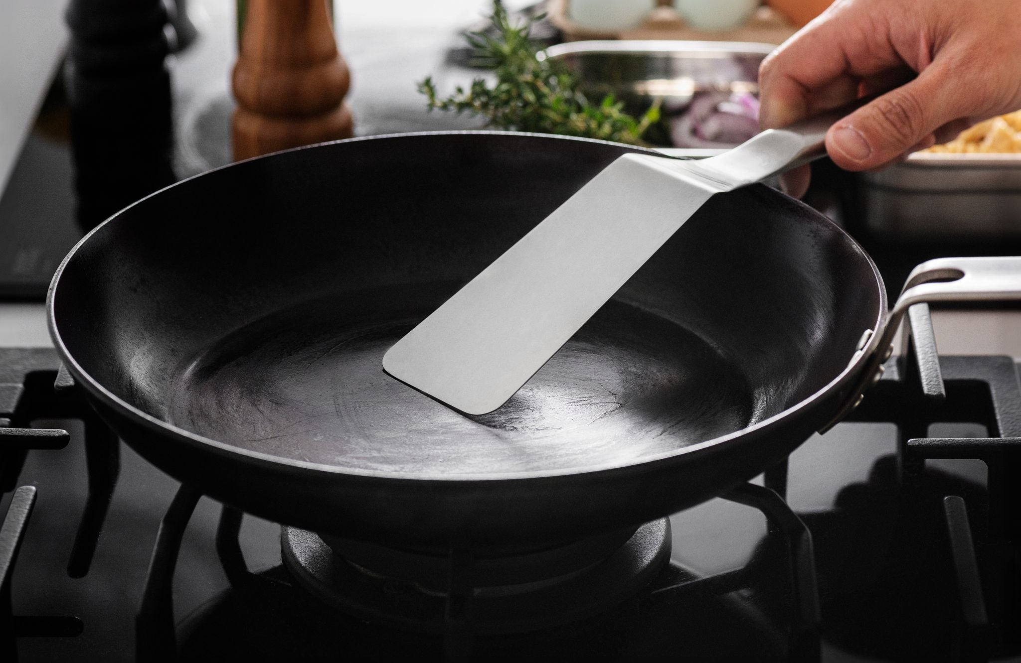 Kolstål, till skillnad från diverse ytbehandlingar, tål ordentliga köksredskap stekspadar och andra redskap av stål. Det finns inga ämnen som kan släppa eller hamna i maten. Och det är pannans tyngd/massa som gör att den kan hålla hög och jämn värme när du steker.