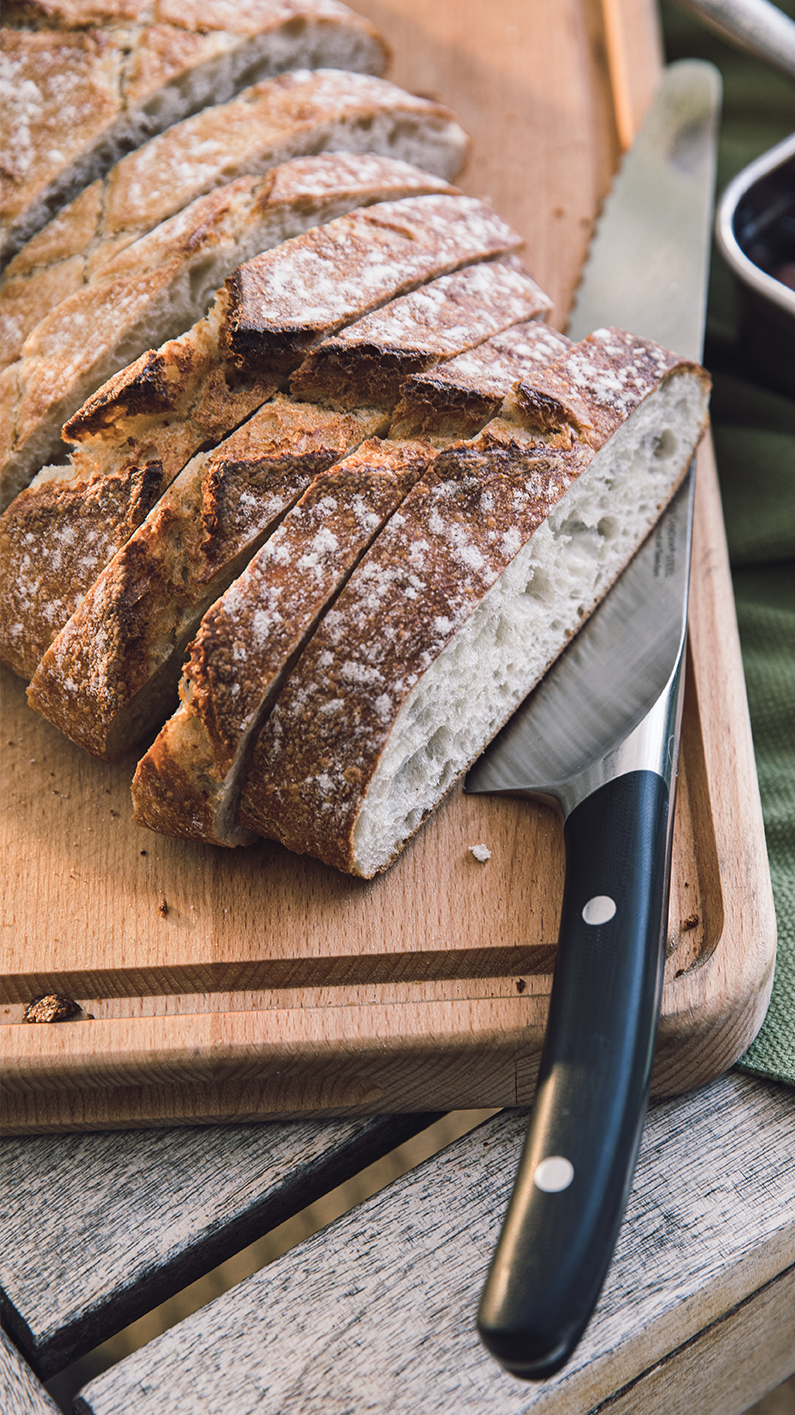 Le couteau à pain, contrairement au couteau de chef, n’est pas un outil personnel dans la cuisine professionnelle. Cependant il doit être de très haute qualité et fonctionner parfaitement entre les mains d’un chef.